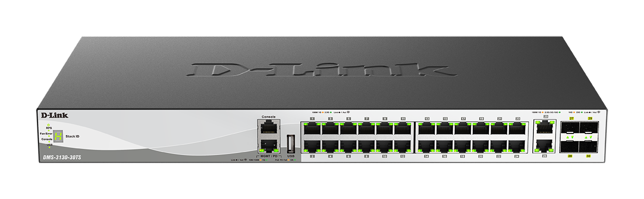 x4 25G SFP28 uplink ports, physical stacking for redundancy, and have built-in G.8032 Ethernet Ring Protection Switching (ERPS) to help minimise recovery times to 50 ms. An USB 2.0 interface to store config files, boot images, and syslog. As well as support for an additional external redundant power supply on all models to ensure maximum uptime. DMS-3130-30PS even supports PoE PD function on the MGMT port, allowing it to be powered by a PoE switch.