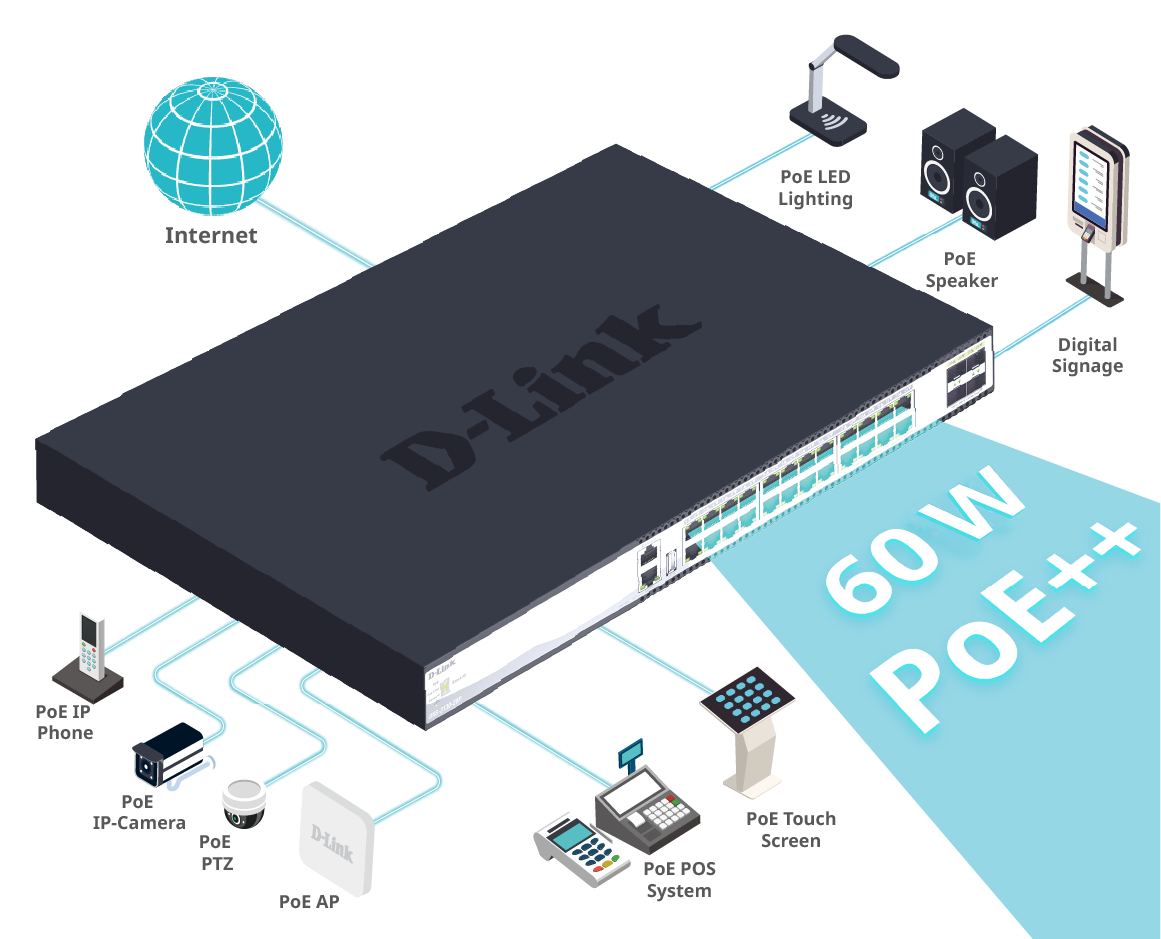 The DXS-3130-28P supports 802.3af/at/bt PoE standards, delivering up to 60 W per port with Perpetual and Fast PoE.