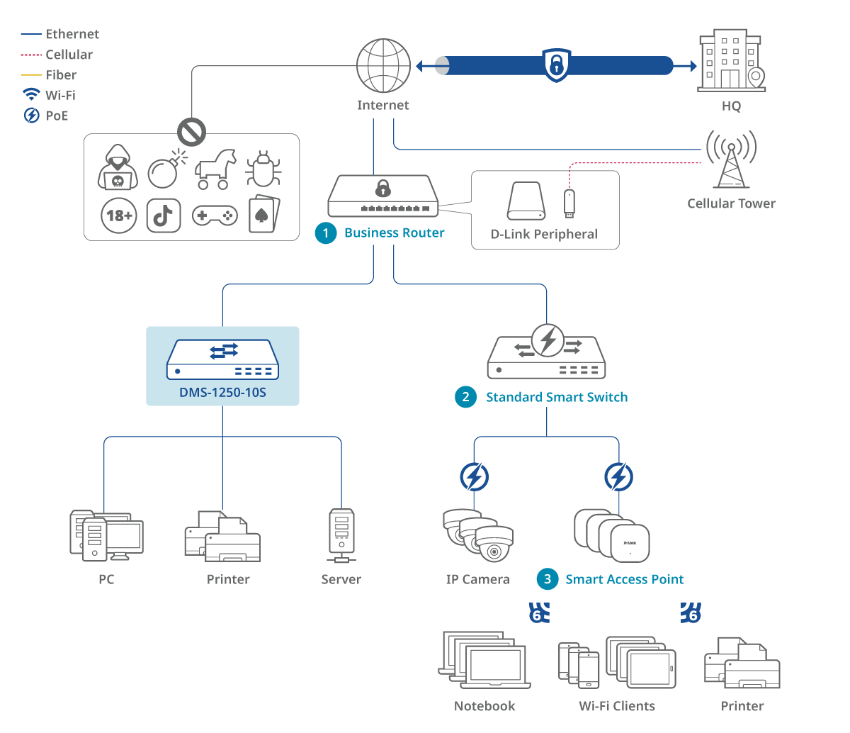 The DMS-1250 Series switches elevate your network with 2.5 Gbps ports, optimized for Wi-Fi 6 access points to maximize throughput and speed. Multi-Gigabit Ethernet eliminates bottlenecks, fully utilizing Wi-Fi 6’s high performance.