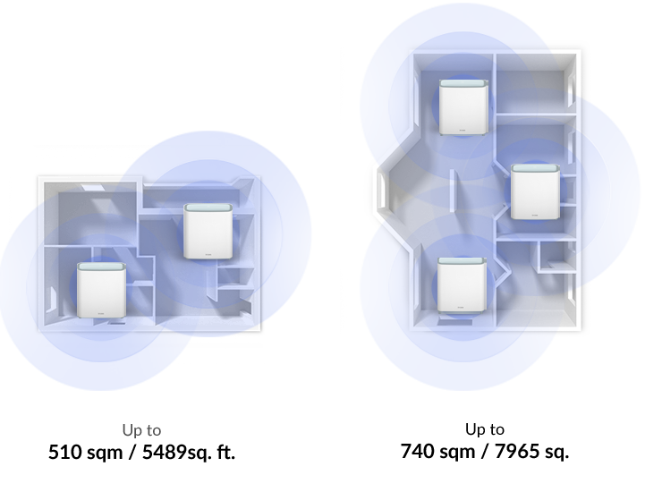 - 2-pack / 3-pack for up to 510 sqm / 740 sqm Wi-Fi coverage