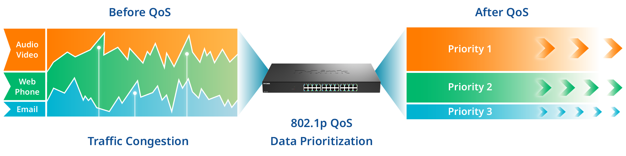 Avec le DMS-1024, vous pouvez gérer facilement le trafic réseau grâce à la fonction Quality of Service (QoS) 802.1p. Le switch est doté de la Qualité de service 802.1p (QoS), qui organise et hiérarchise les données critiques et à durée de vie limitée pour une diffusion efficace, permettant un streaming vidéo sans mise en mémoire tampon ainsi que des appels vidéo et vocaux fluides.
