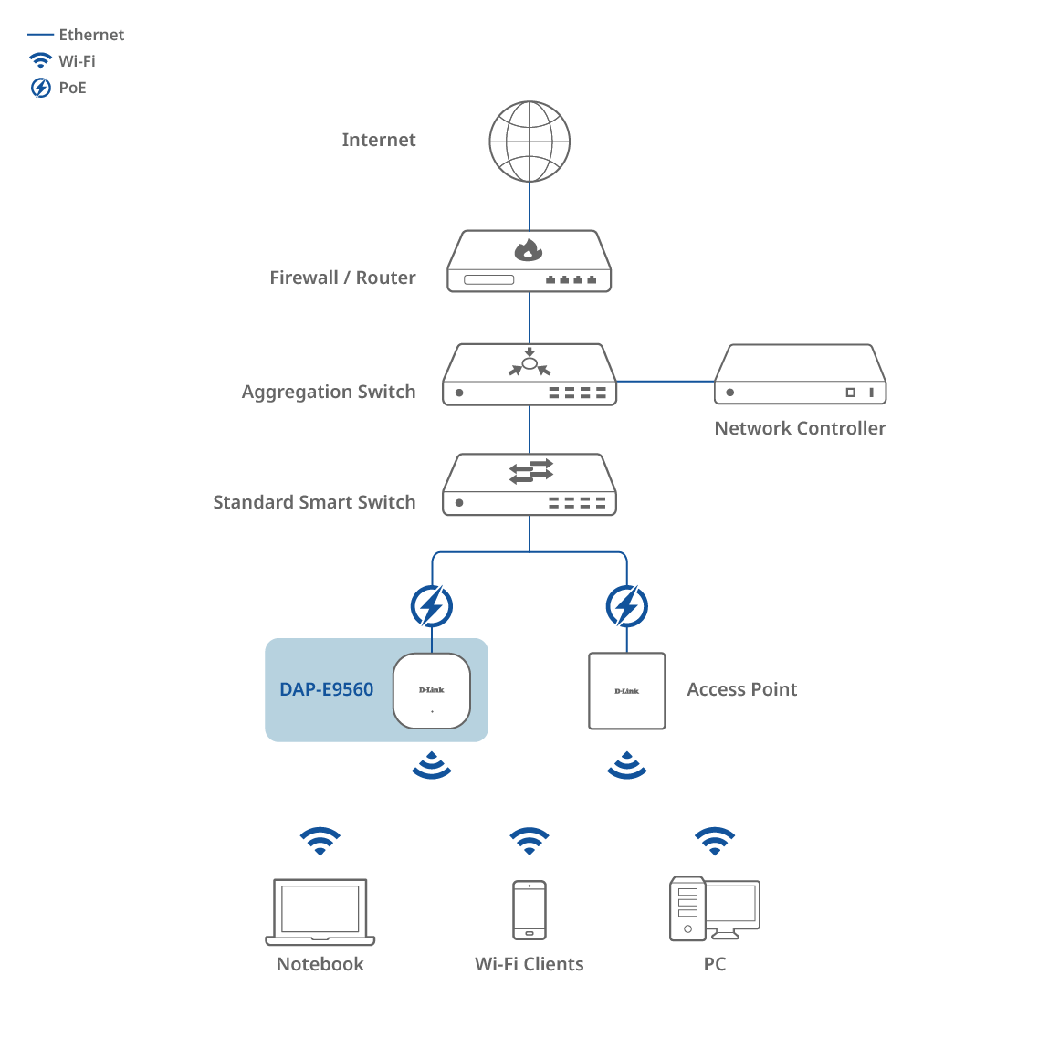 Equipped with both a high-speed 10G PoE Ethernet port and an additional 2.5G Ethernet port, the DAP-E9560 ensures exceptional wired backhaul and flexible uplink options. This advanced design maximizes wired throughput for demanding enterprise environments, fully unleashing the ultra-fast potential of Wi-Fi 7 and supporting high-density, high-performance deployments.