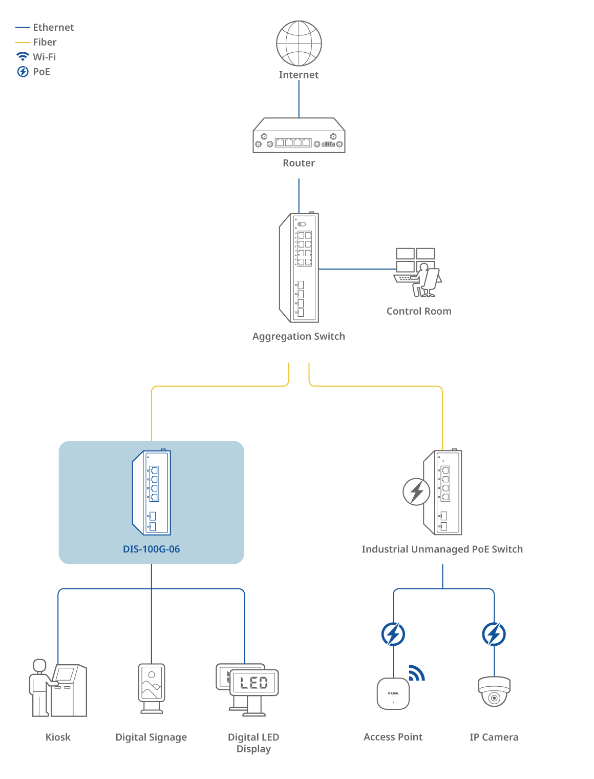 The DIS-100G-06 is an industrial unmanaged switch equipped with four 1G ports and two SFP ports, providing plug-and-play simplicity deployment. The SFP ports support long-range data transmission, removing the distance limitations of traditional Ethernet cabling. With reliable, high-performance operation, it ensures real-time data transfer and seamless connectivity for applications such as Kiosk, digital signage, LED displays, and more.