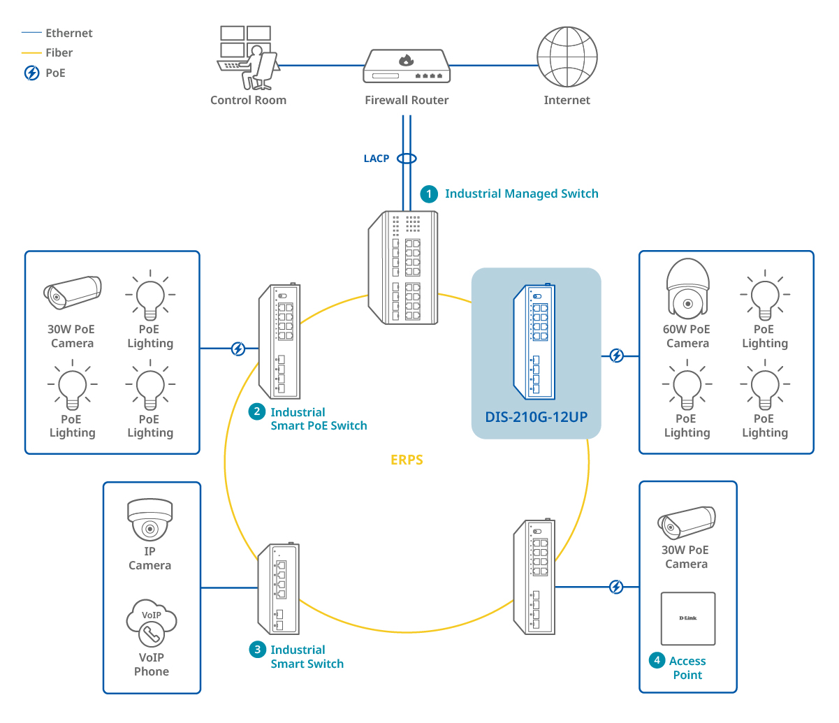 De DIS-210G-12UP combineert ERPSv1/v2 met Operations, Administratie en Onderhoud (OAM) voor een uiterst robuust en eenvoudig te beheren netwerk. ERPS biedt redundante back-uppaden, voorkomt lussen en maakt snelle failover mogelijk met hersteltijden tot 50 ms. OAM-functies (Y.1731, 802.1ag, 802.3ah) bewaken continu fysieke verbindingen en virtuele circuits, zodat netwerkbeheerders problemen snel kunnen identificeren. Samen verbeteren deze functies de netwerkbetrouwbaarheid, minimaliseren ze uitvaltijd en garanderen ze een consistente servicekwaliteit.