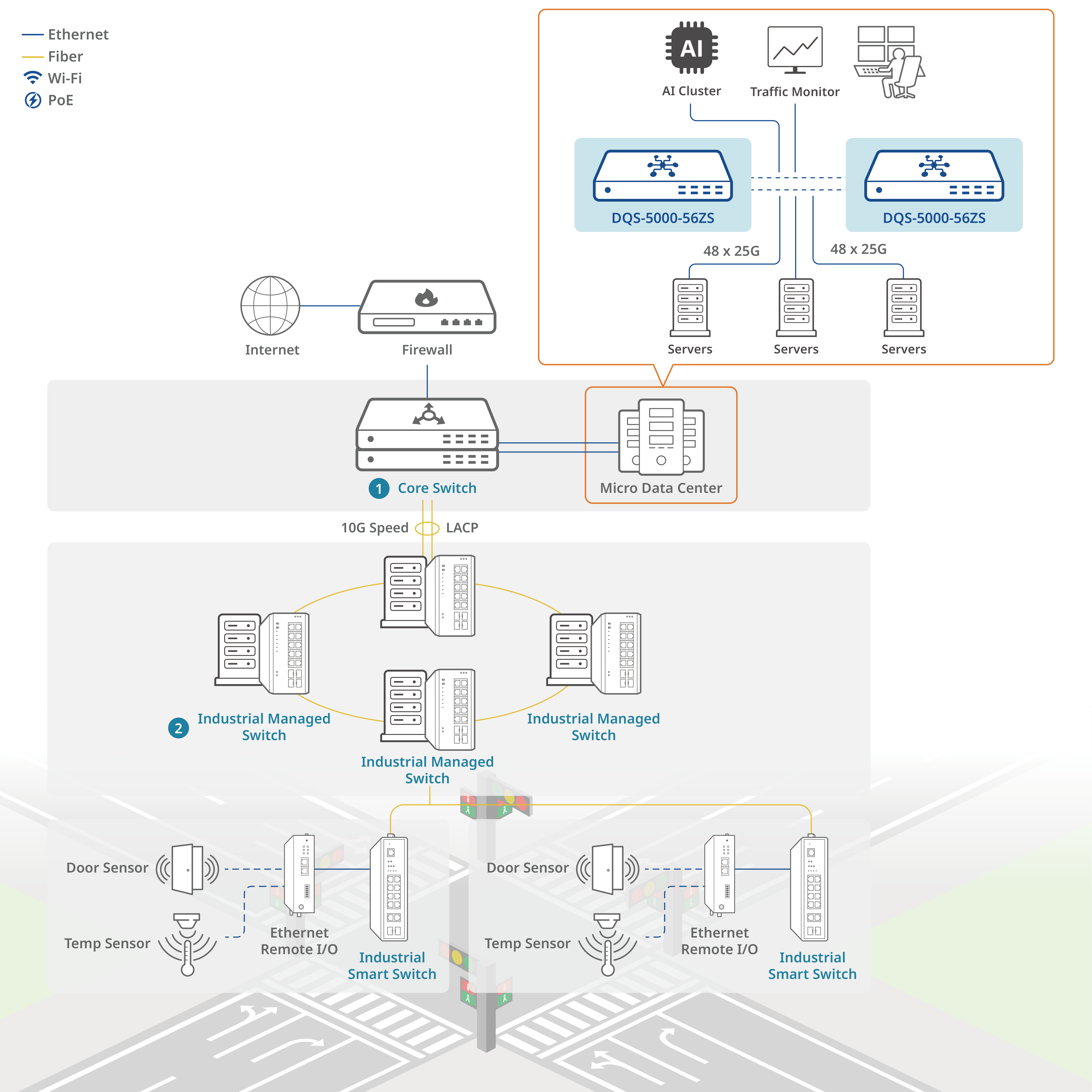 Traffic monitoring vraagt om high-availability, high-performance network infrastructure. De DQS-5000-56ZS voldoet aan deze behoeften met MC-LAG, hot-swappable PSU en ventilatoren, 25G downlinks voor endpoint aggregatie en 100G uplinks voor database- en opslagconnectiviteit.