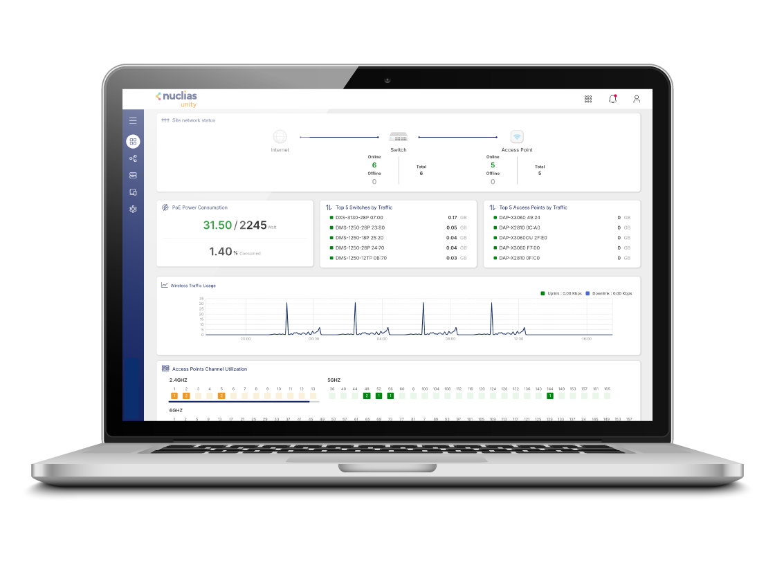 Nuclias Unity is your single pane of glass for complete, cloud-based network control. Unify the setup, monitoring, and security of all your APs and switches from one intuitive dashboard. Visualize your entire network on a live topology map, push centralized configurations with a click, and get proactive alerts. Deploy faster, troubleshoot smarter, and simplify your IT life and reclaim your time.