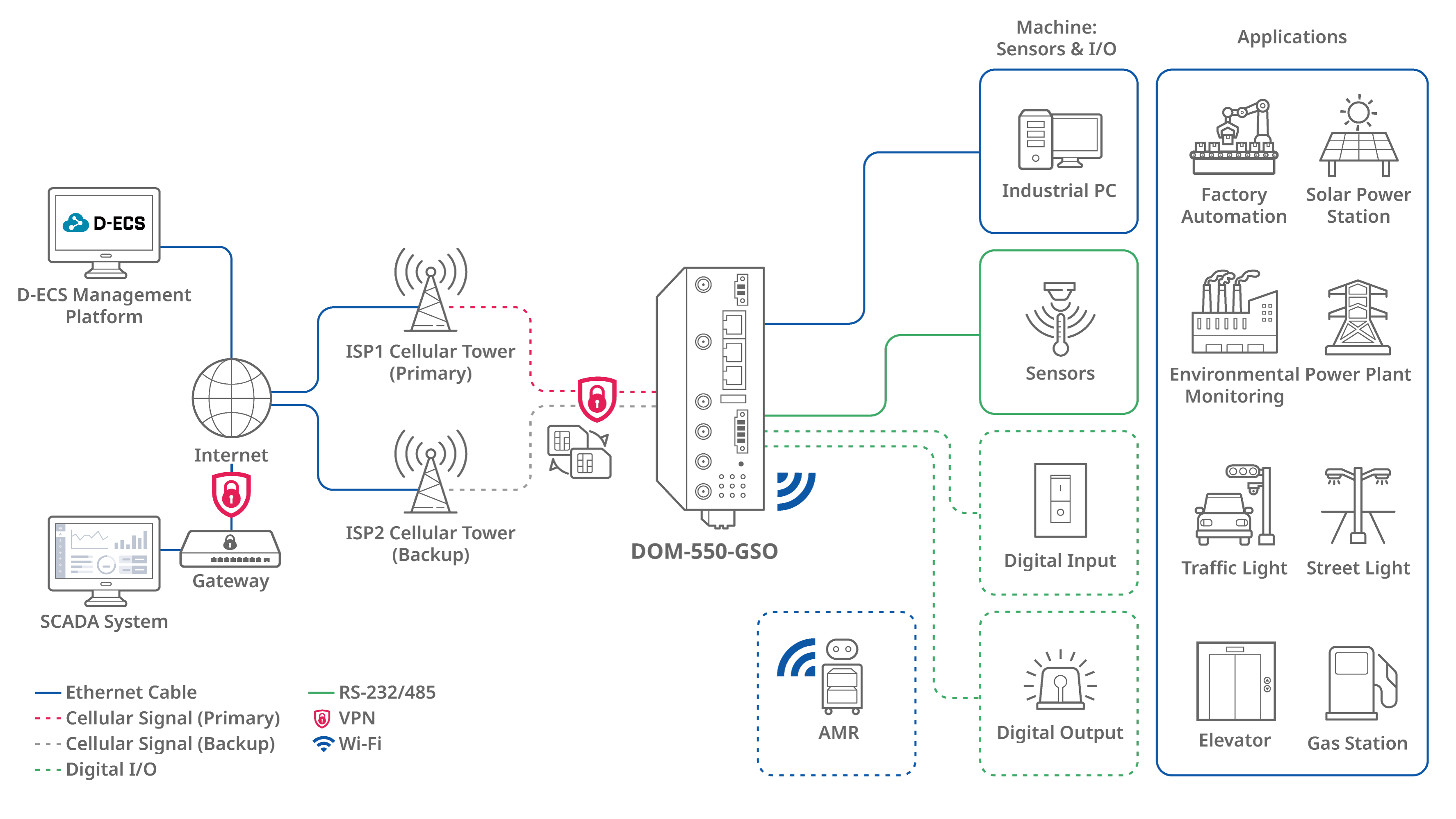 Díky své kompatibilitě s více rozhraními, včetně RS-232/485 a digitálních I/O (DI/DO), DOM-550-GSO posouvá pokročilou technologii 5G hluboko do sítí provozních technologií (OT). Bezproblémově převádí data mezi protokoly Modbus RTU/ASCII a TCP, což usnadňuje konfiguraci, odstraňování problémů a integraci do sítě.