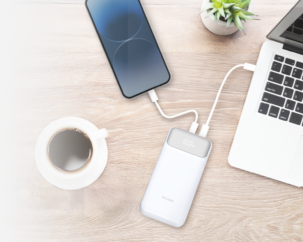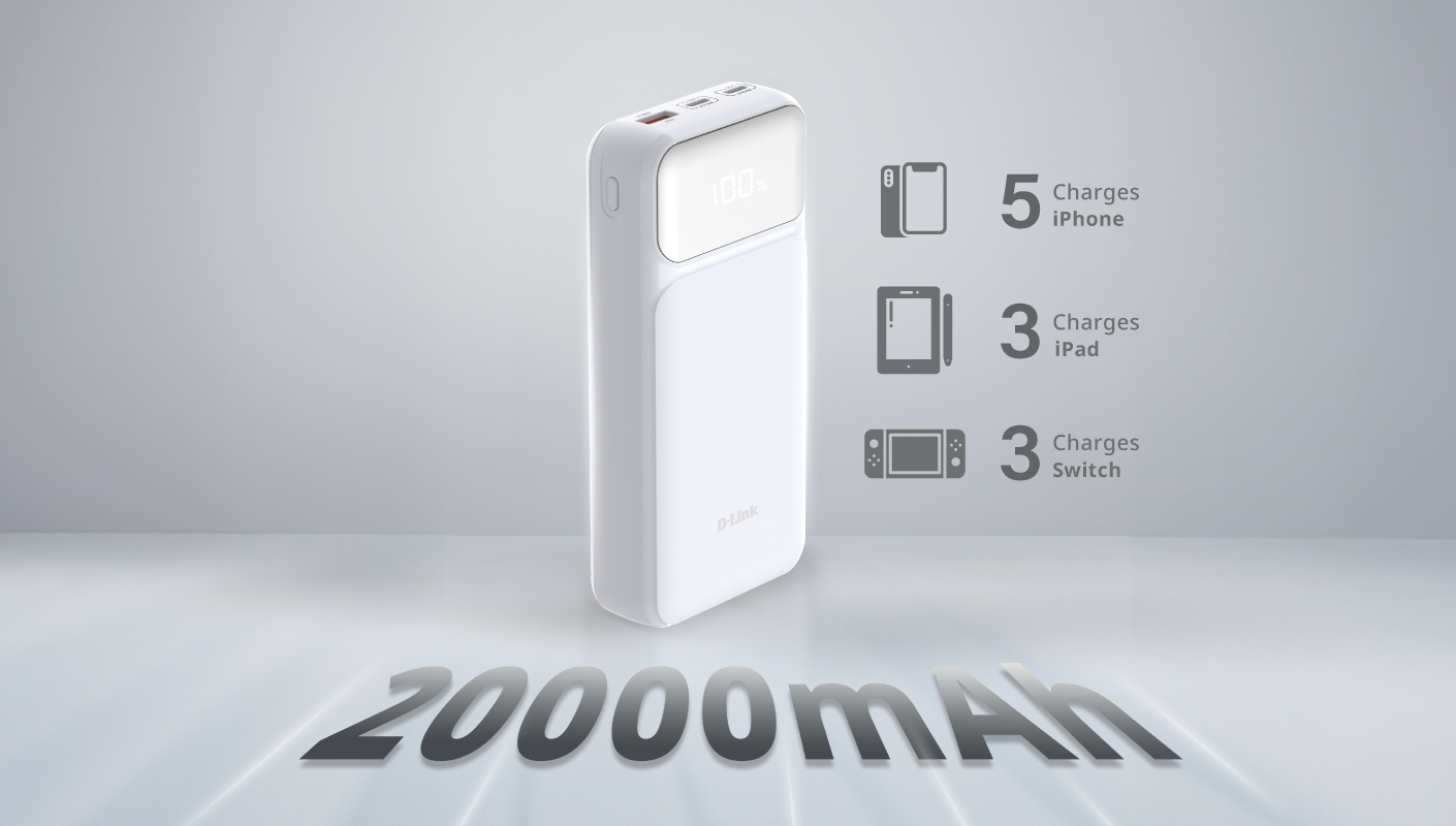 D-Link DPP-201 je kompaktní, ale výkonné řešení pro všechny vaše potřeby nabíjení. Díky vysoké kapacitě 20 000 mAh udrží vaše zařízení v provozu déle, ať už cestujete, pracujete na dálku nebo jste na cestách. DPP-201 dokáže nabít iPhone X 5krát, iPad mini 3krát nebo Nintendo Switch 3krát.*
