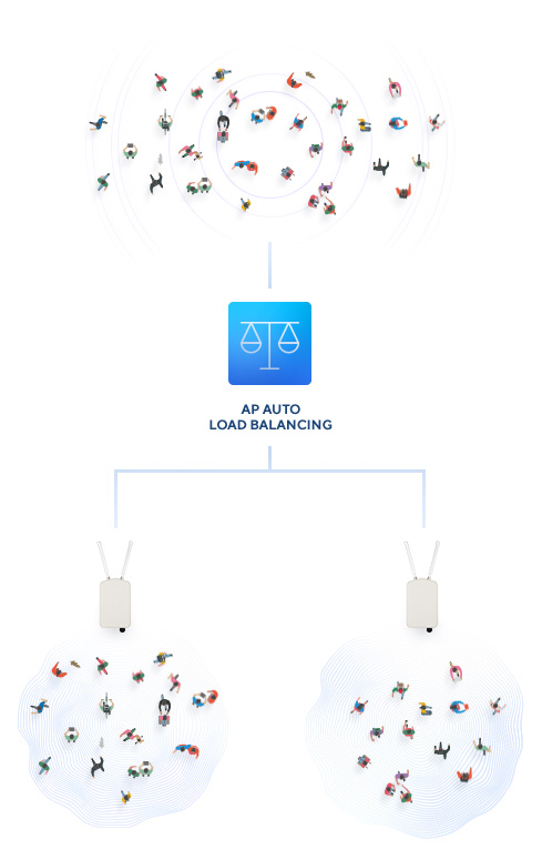 Optimalizované vyrovnávání zátěže (Load-balancing) účinně eliminuje potřebu specializovaného hardwaru a RF expertizy, které jsou jinak obvykle nutné k vyladění bezdrátové sítě. Připojení jsou spravedlivě rozdělená mezi okolní přístupové body, aby nedocházelo k zahlcení kteréhokoli bodu ve vaší Wi-Fi. Výsledek? Stabilní a konzistentní připojení pro každého uživatele.