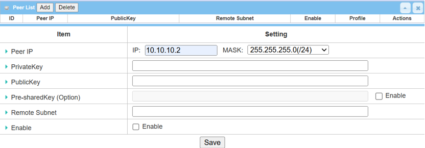 3. Click the Add button of the Peer List to create Peer Configuration for WireGuard Clients.