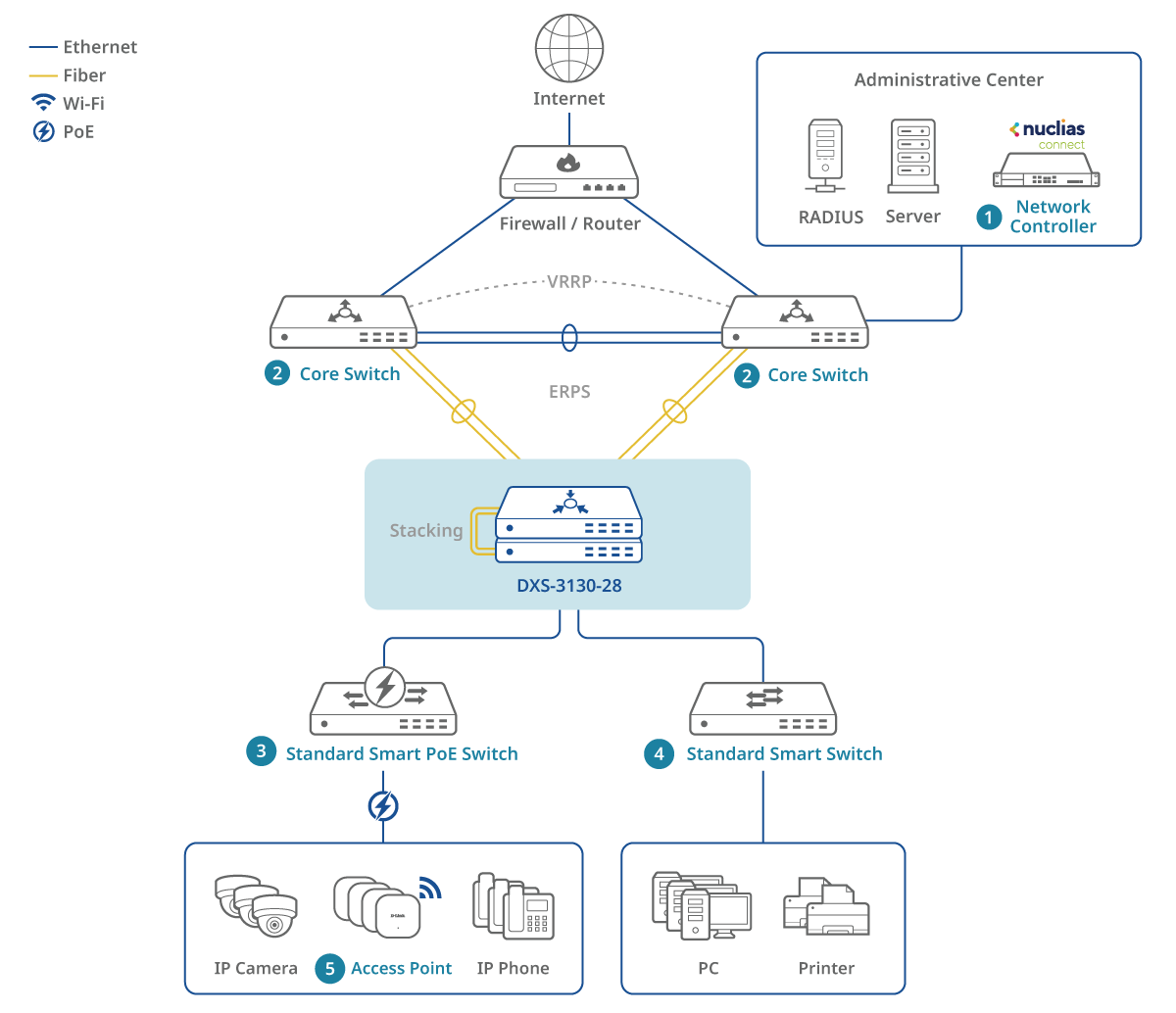 The DXS-3130-28 ensures continuous uptime with redundant power and stacking. It's 50ms ERPS recovery minimizes downtime, loop back detection blocks storm-affected ports, and VRRP provides seamless backup routing making it ideal for hospitals, factories, and other mission-critical networks.