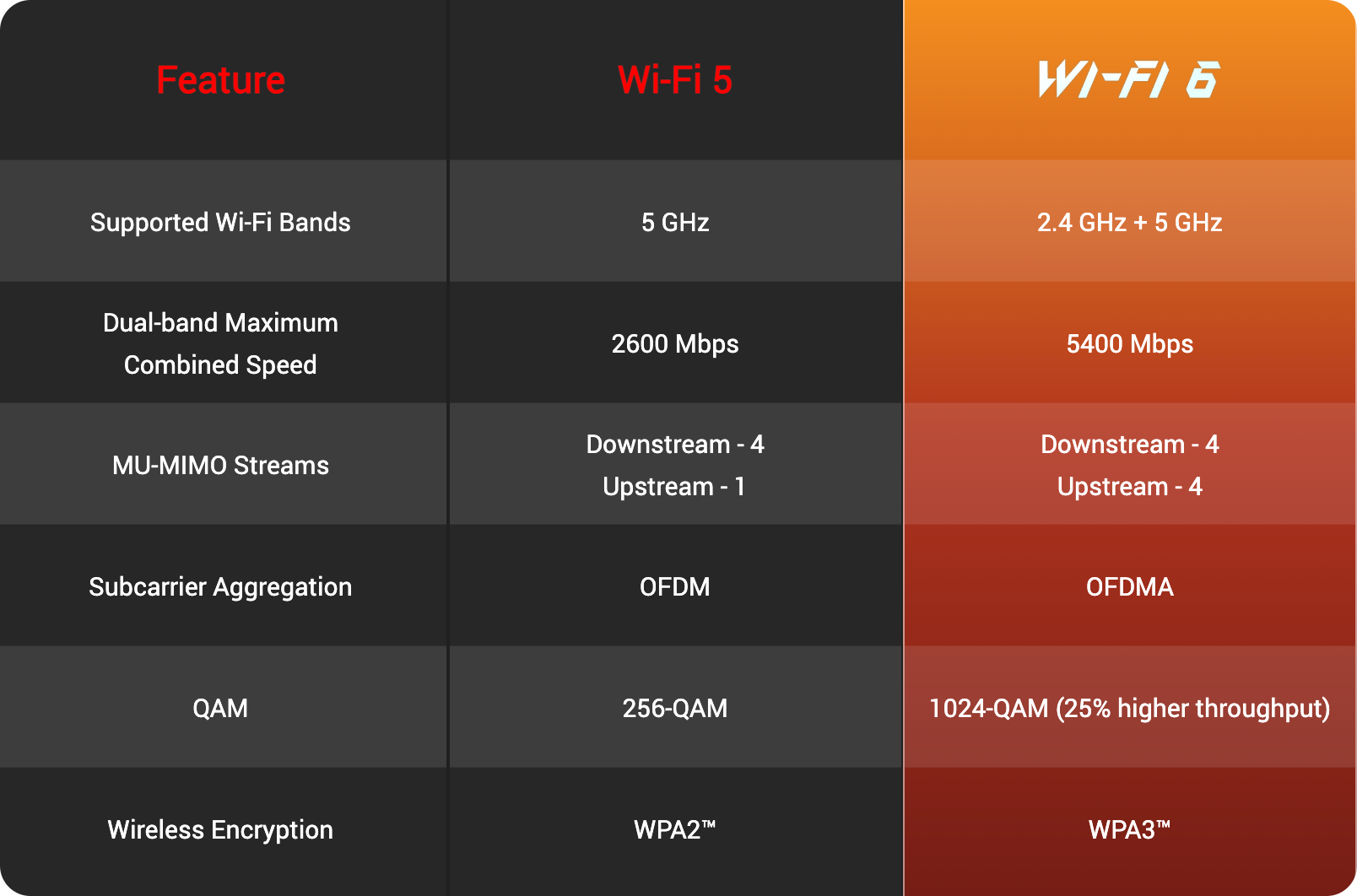 Unlike the existing 11ac wireless standard that operates only in the 5 GHz range, Wi-Fi 6 fully utilizes both 2.4 GHz and 5 GHz bands. It also comes with 1024 QAM to boost throughput to devices by up to 25%, and 160 MHz contiguous channel width for even more bandwidth.