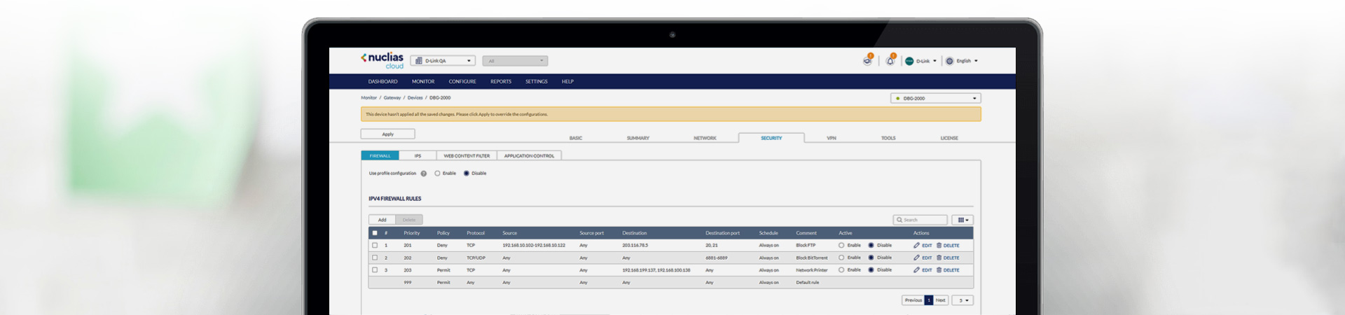 Nuclias Cloud empowers you with essential tools, such as Content Filters, Firewalls or Application Control. Define your policies as necessary, and then roll them out across the entire network for greater network-wide consistency.