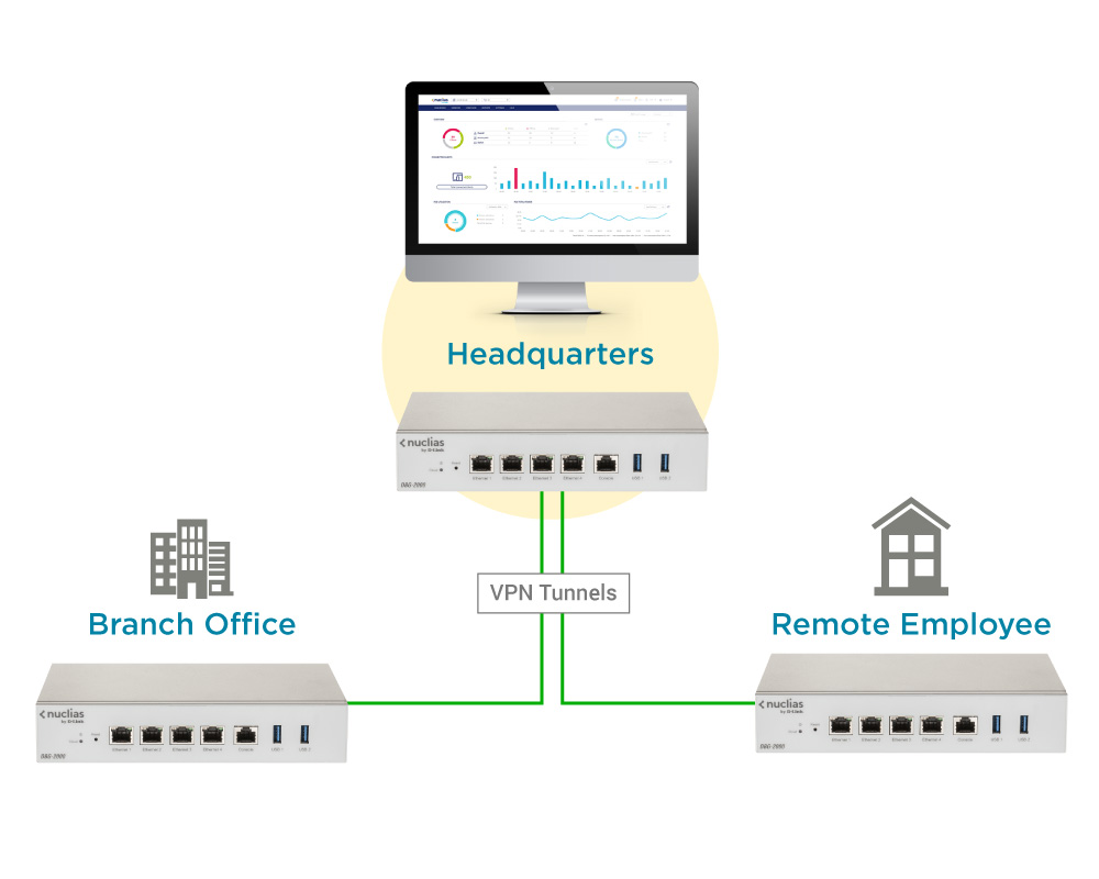 Nuclias enables easy P2P VPN tunneling for better business privacy and remote working. Rapidly establish your VPN via the Nuclias dashboard for more secure connections.