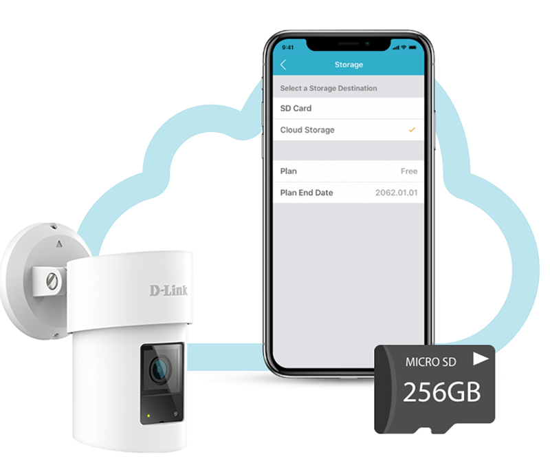 The DCS-8350LH lets you record snapshots and video clips to the Cloud for anytime access. Play back recordings from the Cloud or download footage to your mobile device from anywhere, anytime. Alternatively, store your footage directly to a microSD card. With support for a whopping 256 GB you can save days-on-end of footage. It also cleverly records over your old footage, leaving you with one less thing to worry about.
