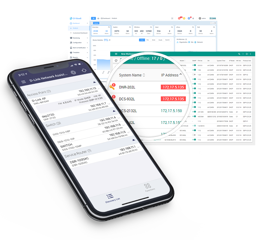 Managed multiple large wired/wireless device networks with D-View 7 for centralised management to reduce costs and maintenance. D-Link Network Assistant (DNA) is also available to easily set up and manage smaller networks.