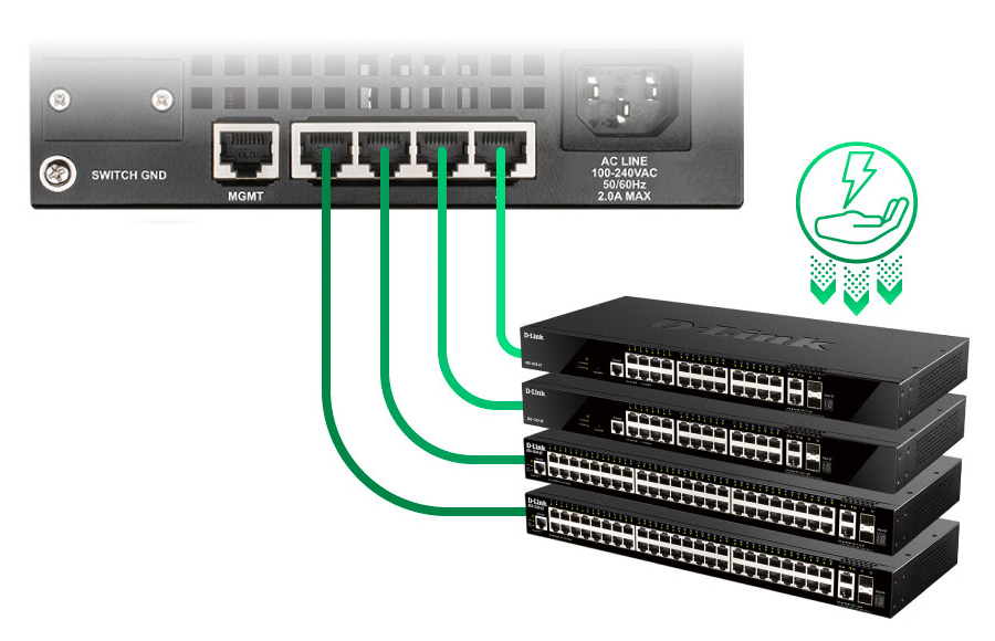 Stack up to eight DGS-1520 switches using both copper 10GBASE-T and/or fibre SFP+ ports. The hybrid stacking support adds flexibility as well as lowering the cost of cabling by using copper instead of all fibre.