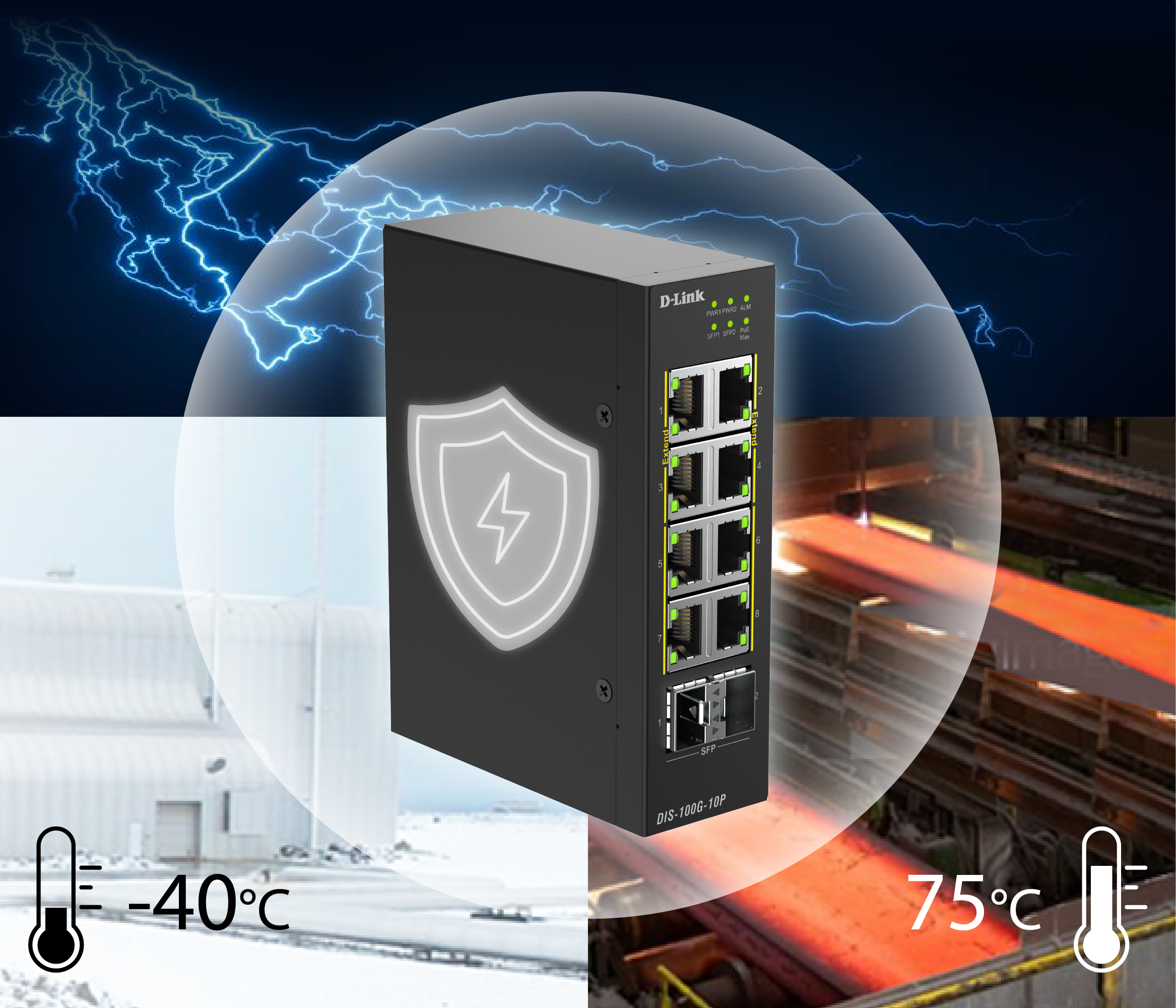 The DIS-100G-10P is built with a rugged, durable design ideal for harsh environments such as outdoor installations, unconditioned factory floors, and remote sites. With a wide operating temperature range of -40°C to 75°C, it ensures stable and reliable performance even in extreme conditions. The fanless design and 6kV surge protection on all Ethernet ports help reduce the risk of downtime and enhance long-term reliability.