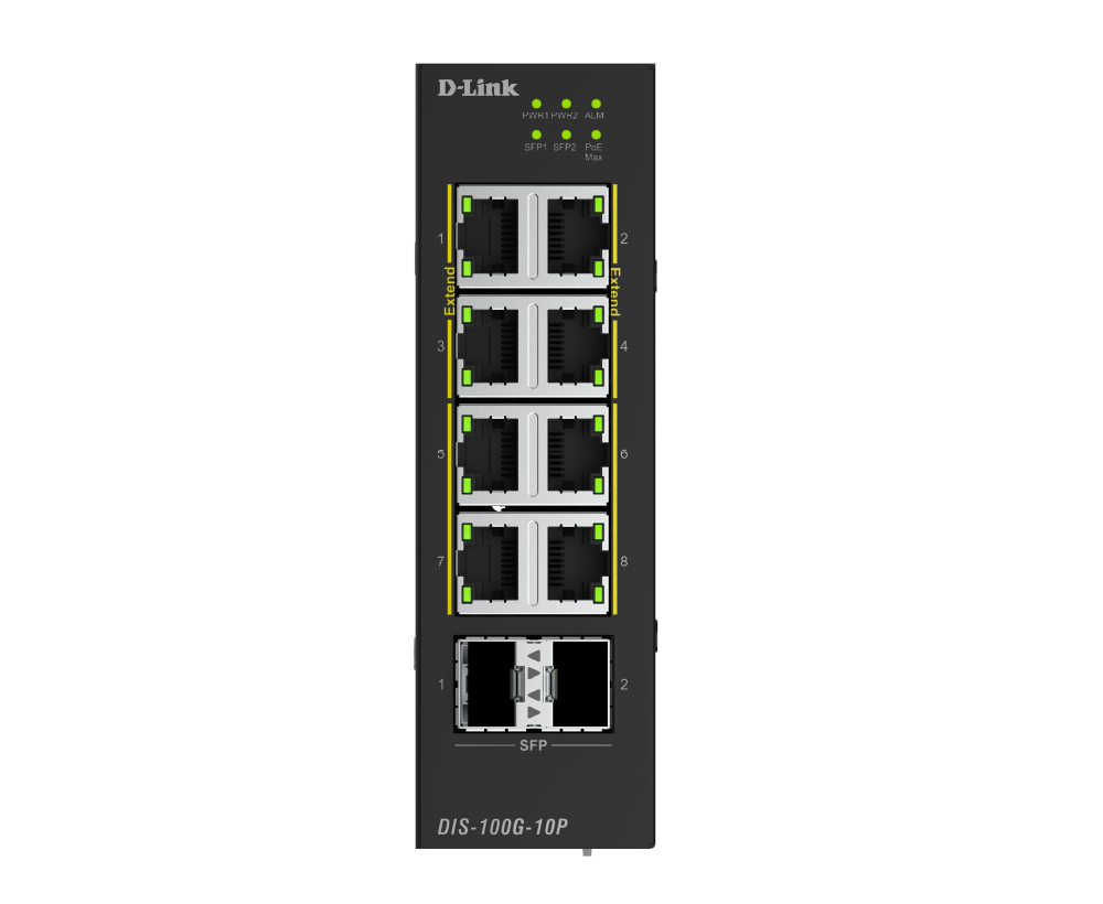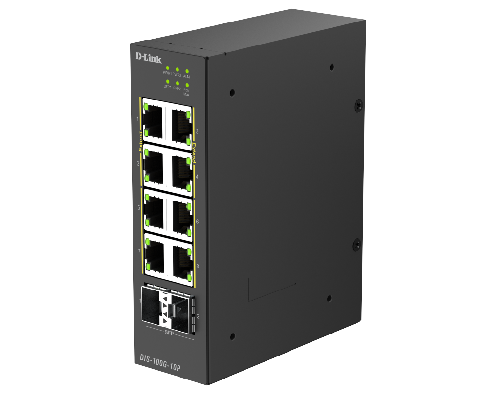 The DIS-100G-10P is an industrial unmanaged switch equipped with eight 1G PoE ports and two SFP ports, providing plug-and-play simplicity for deployment. The SFP ports support long-range data transmission, removing the distance limitations of traditional Ethernet cabling. With reliable, high-performance operation, it's well-suited for edge deployments in applications like HD surveillance, wireless access points, and more.
