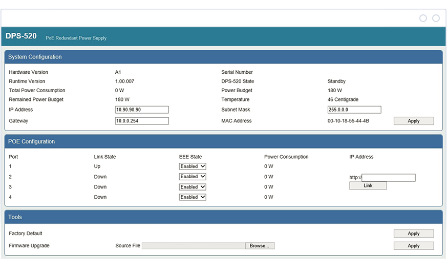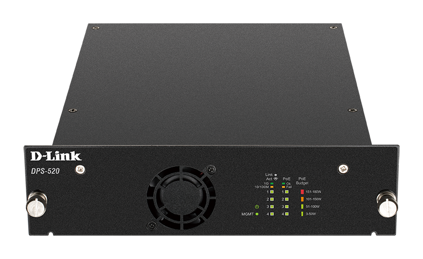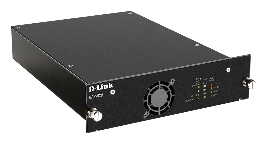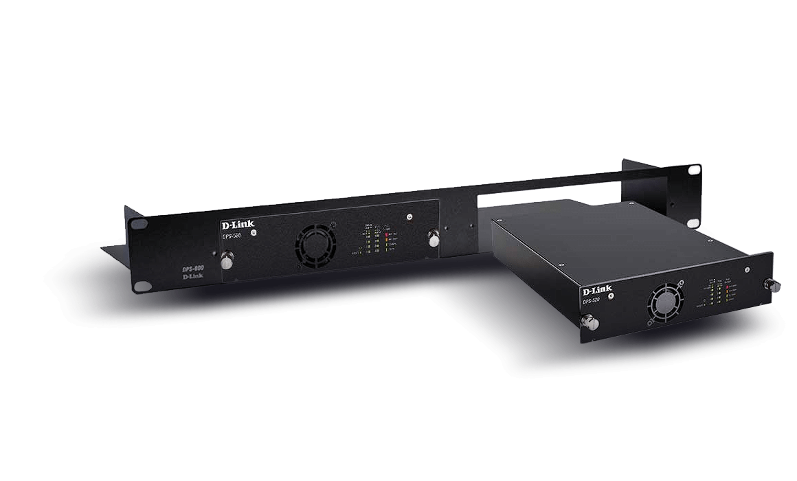 The DPS-520 is compatible with DGS-1520-28 and DGS-1520-52 and can be installed as a standalone power supply unit or onto a standard mounted switch rack by inserting it into an optional DPS-800 open chassis, designed to hold x2 DPS-520 RPS units.