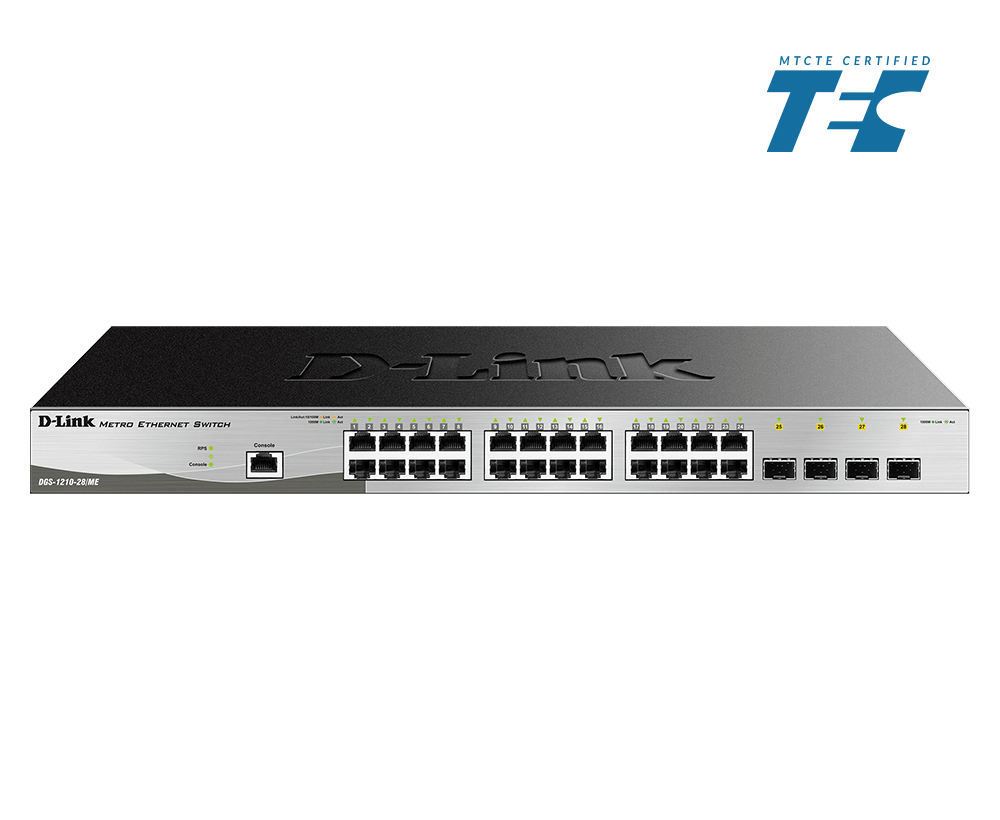 The DGS-1210ME Series Metro Ethernet Switches feature a variety of port configurations, including 10/100/1000BASE-T RJ-45 ports, 1G SFP ports, and 10G SFP+ ports for increased network bandwidth. Surge protection, advanced Layer-2 functions, and a suite of security and management tools make the DGS-1210ME Series Metro Ethernet Switches ideal for Metro Ethernet applications.
