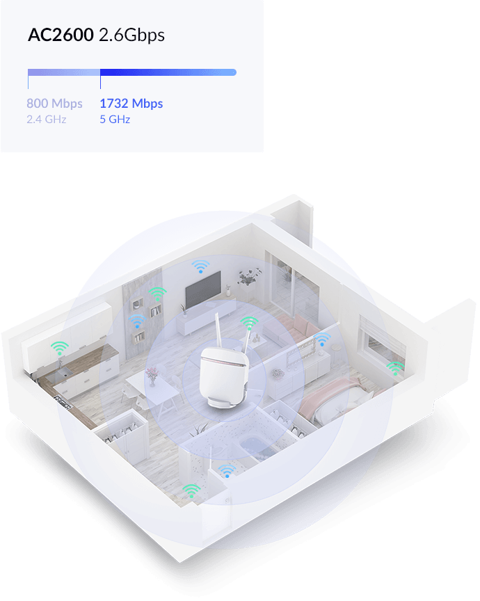 High-performance antennas deliver high-performance AC2600 speeds of up to 2.6 Gbps throughout your home.