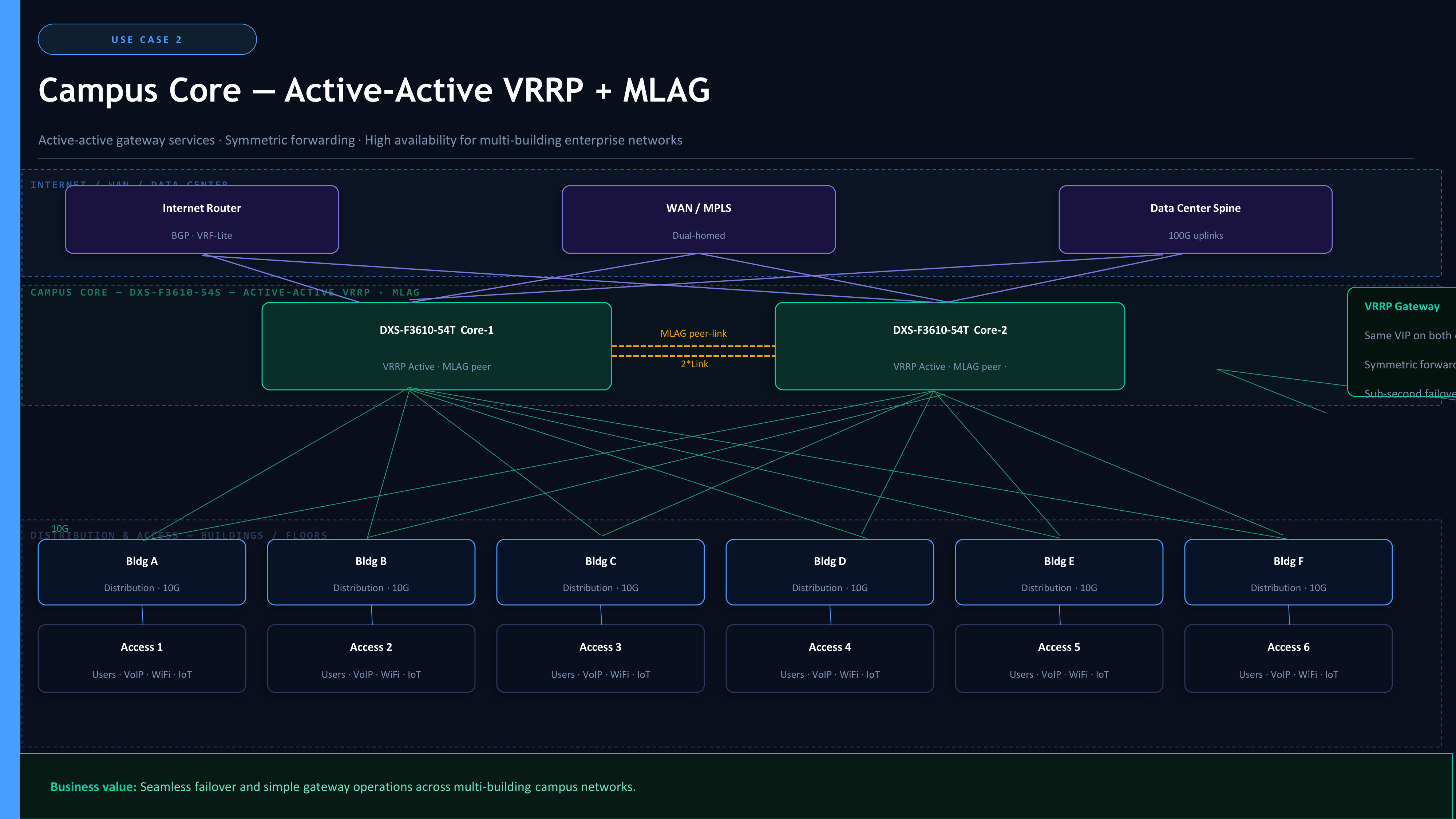 Campus core delivering active-active gateway services with symmetric forwarding and high availability for multi-building enterprise networks.