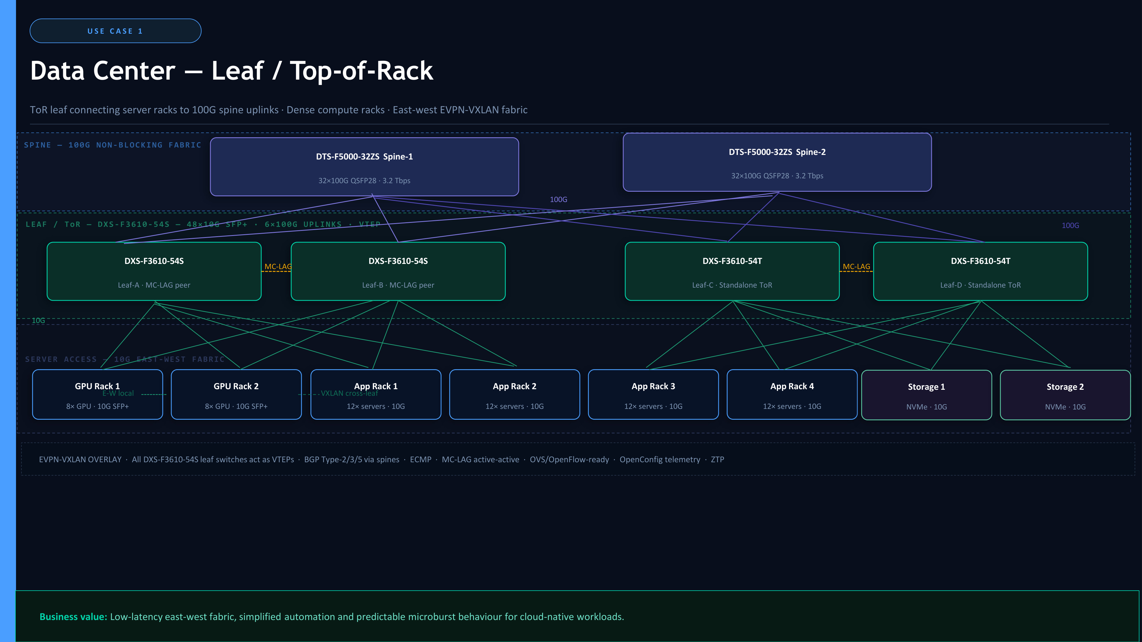 ToR leaf connecting server racks to 100G spine uplinks. Ideal for dense compute racks and east-west application traffic within an EVPN-VXLAN fabric.