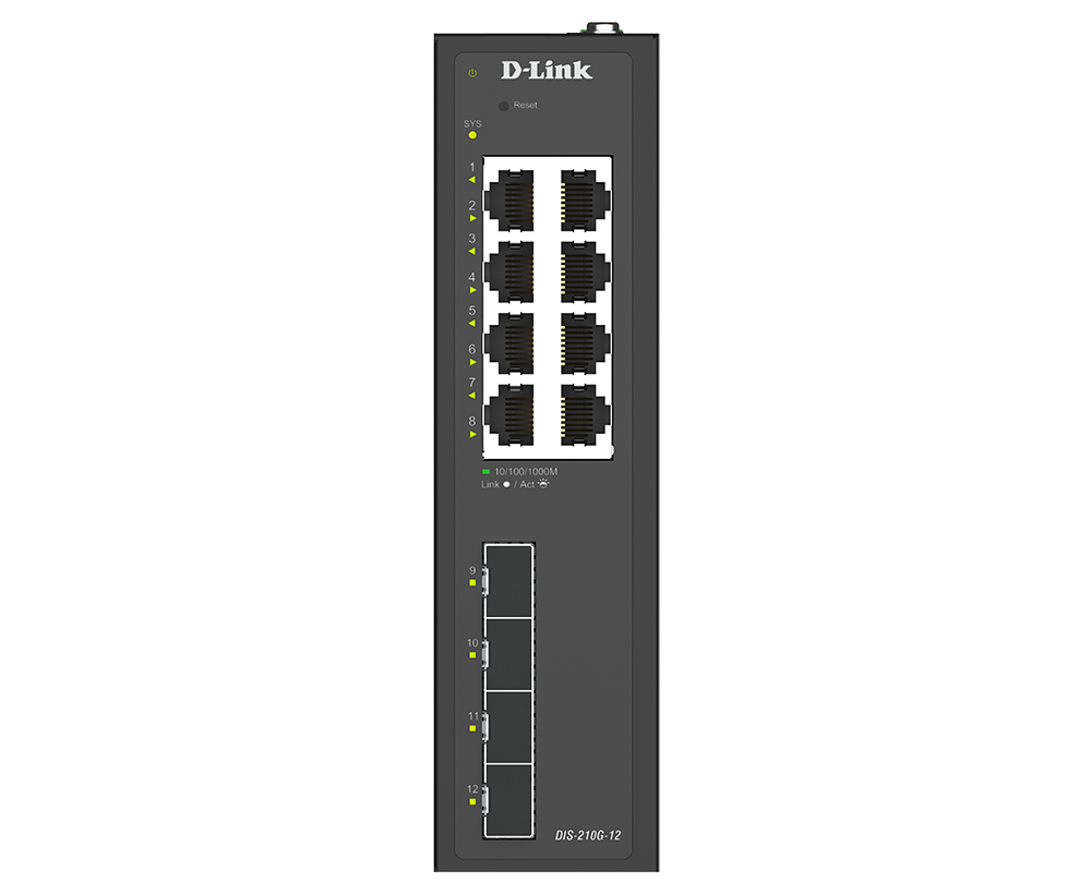 The DIS-210G-12 is an industrial smart switch equipped with eight 1G ports and four 1G SFP ports for network management and aggregation. The SFP ports support long-distance data transmission, rapid failover redundancy, and throughput aggregation. The DIS-210G-12 supports ERPS and static routing, which reduces latency, enables effective traffic control, and improves network scalability and efficiency.
