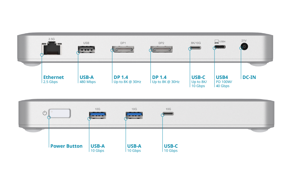 The DUF-901 equips your laptop with nine versatile ports to power both work and entertainment. Experience stable 2.5 Gbps Ethernet networking, stunning 4K/8K visuals through dual DP 1.4 and a multifunction USB-C port (DP Alt Mode, up to 8K), and lightning-fast transfers, 40 Gbps with USB4 and 10 Gbps with the auxiliary USB-A/C ports. An additional USB-A (480 Mbps) ensures compatibility with legacy devices, all within one sleek, powerful dock.