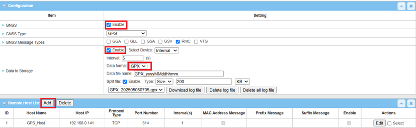 Enable · Select Device Select Internal device to store log data · Interval By default, 5 seconds is set. Value Range: 5 - 60 seconds · Data Format Select GPX data format to store · Data file name Define file name to store · Split Enable Check the Enable box to split large files · Split Size & Unit Define file size and unit for splitting each log file. The default is 200 KB and the minimum is 10 KB · Download log file Select a log file and click Download log file to download through Web |