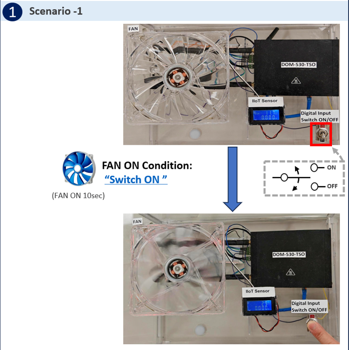 When DI receives an event (High for 1 second) from the "switch button", DO performs an action to turn FAN ON for 10 seconds.