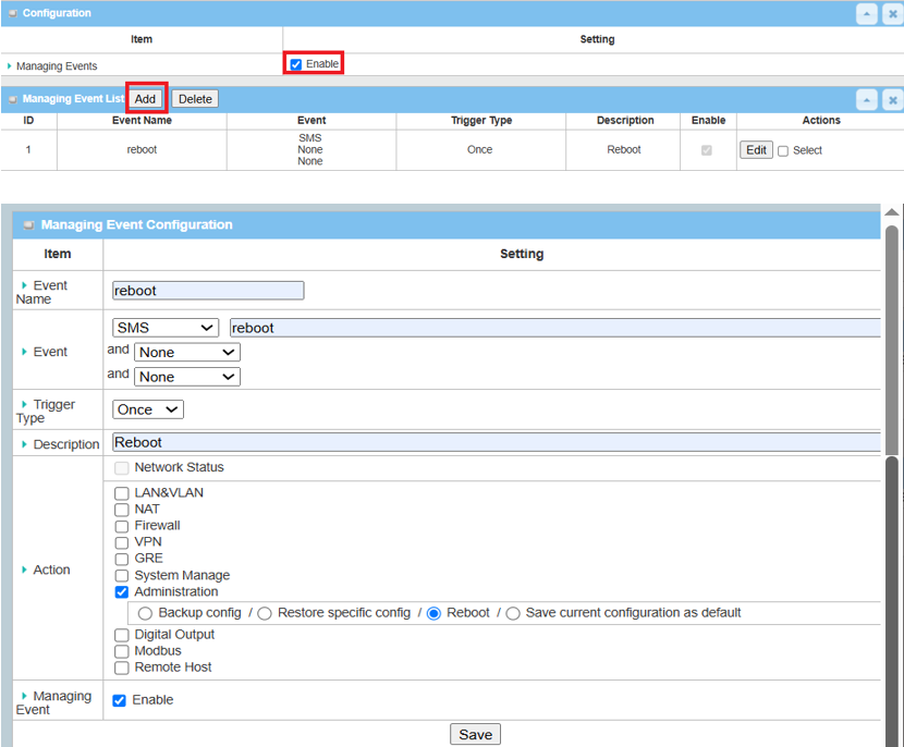 Various SMS controls can be applied to monitoring systems and can be quickly enabled after simple configuration, which is suitable for remote device management, saving time and effort. In this example, we will show the SMS configuration rules of M2M devices and how to set trigger events to take action on the device when trigger events come from SMS.