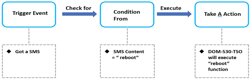 Let us take the DOM-530-TSO and a mobile phone as an example. When the user sends an SMS message to the DOM-530-TSO with a reboot message, the DOM-530-TSO reboots.