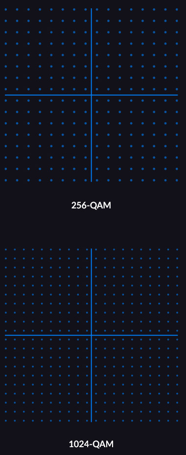 Utilisez la modulation d'amplitude en quadrature 1024 du Wi-Fi 6 (1024 QAM) pour faciliter des quantités massives de transferts de données, ce qui est une grande amélioration par rapport au schéma de modulation Wi-Fi 5 précédent (256 QAM). Il ajoute 2 autres bits de données par symbole transmis (total de 10 bits), permettant au Wi-Fi 6 d'assurer une haute qualité de service (QoS) pour les sites à fort trafic tels que les stades, les gares et les centres de congrès. C'est une augmentation impressionnante de 25% du débit des données.