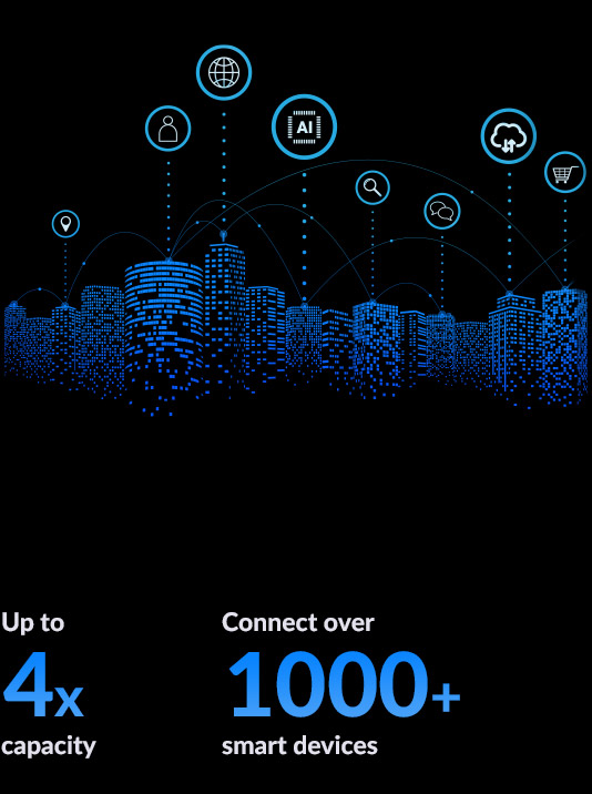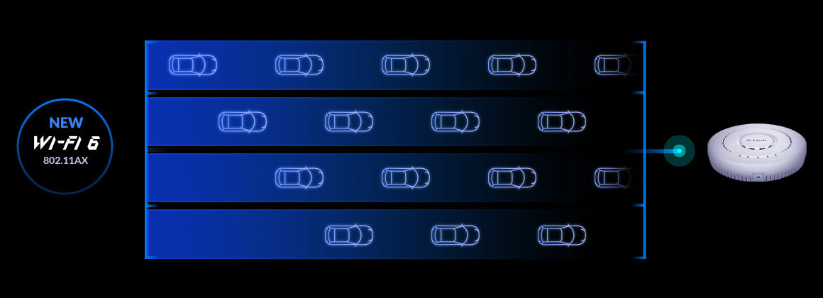 Le Wi-Fi 6 utilise 8x8 MU-MIMO pour réduire considérablement la latence, permet les chargements et les téléchargements, et a une augmentation de capacité X4 par rapport à SU-MIMO. Développez votre entreprise avec plus de facilité et de capacité réseau que jamais.