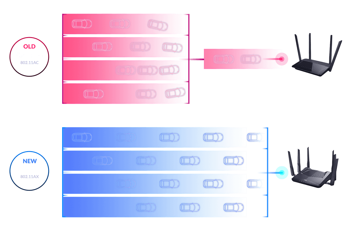 Désormais, le Wi-Fi 6 avec 8x8 MU-MIMO transmet simultanément à plusieurs appareils via plusieurs antennes en utilisant différents signaux sans fil (flux spatiaux 2,4 GHz et 5 GHz) et permet à la fois les téléchargements et les téléchargements pour une efficacité de bande passante considérablement améliorée.