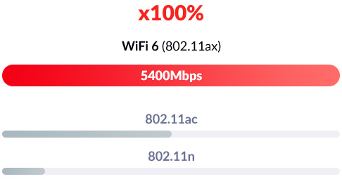 Le Wi-Fi 6 fonctionne en utilisant le 1024-QAM afin de fournir un signal qui stocke beaucoup plus de données et 160 MHz pour un canal plus large offrant un réseau Wi-Fi beaucoup plus rapide avec une efficacité sans précédent. Désormais, vous pouvez profiter des dernières technologies telles que les jeux en réalité virtuelle, la diffusion 4K, ainsi que de multiples conférences téléphoniques sans soucis et de téléchargements de fichiers plus rapides.