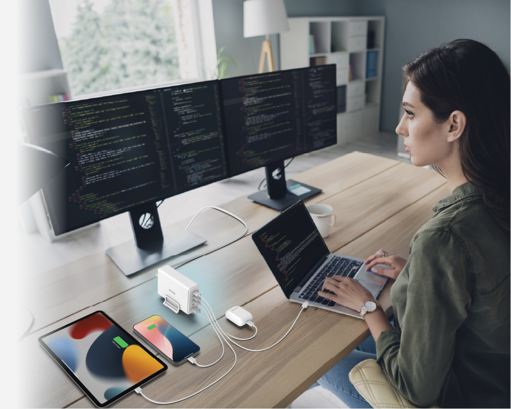 Working at home with multiple devices? The DCF-241 240W GaN Charger delivers fast, reliable power to your laptop, cell phone, tablet, and more, all at once. With five charging ports and a compact stand holder, it keeps your workspace organized, eliminates cable clutter, and ensures your day runs smoothly from start to finish.
