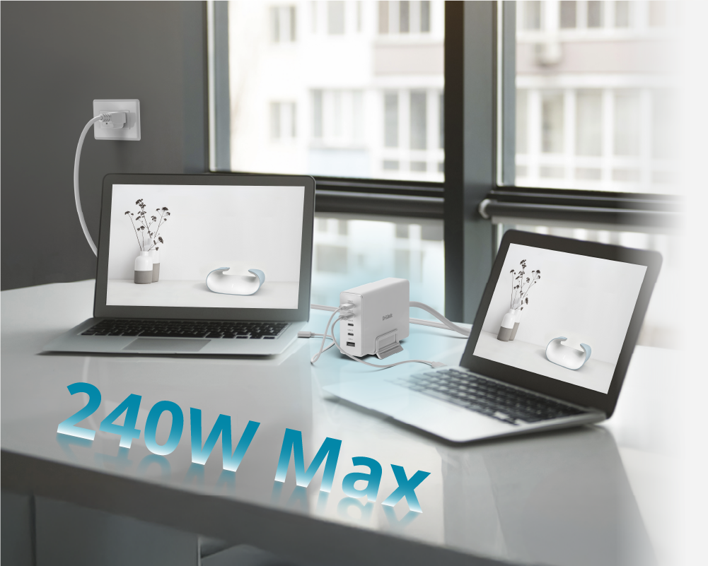 The DCF-241 240W GaN Charger delivers fast, efficient charging for up to five devices at once, including two laptops along with your tablet, cell phone, and more via four USB-C and one USB-A port. With advanced safety protection and GaN technology, it ensures safe, reliable power. The compact stand holder keeps your workspace clean, making it ideal for productive, clutter-free desk setups.