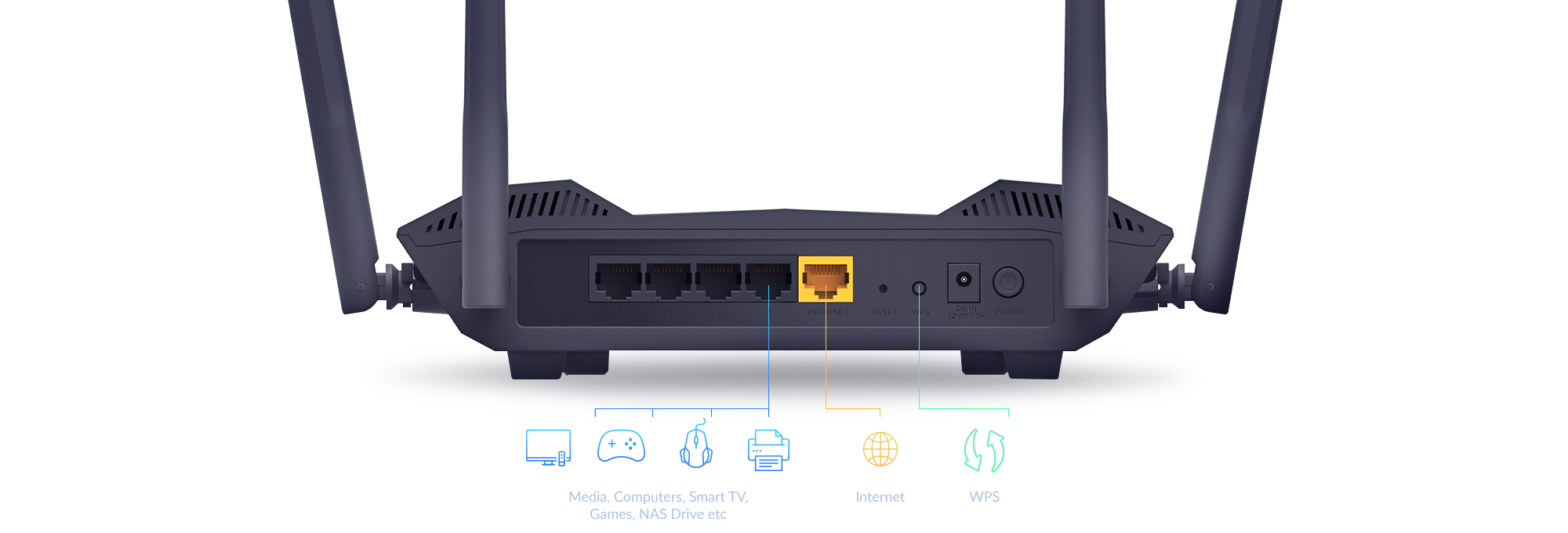 4 high-gain external antennas, and built-in power amplifiers work together to generate a broader and more reliable Wi-Fi signal to reach more rooms and provide coverage throughout your home2.