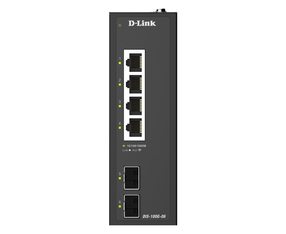 The DIS-100G-06 features two SFP ports that enable flexible, long-distance fiber connections, perfect for extending your network across remote sites or between buildings. Fiber optic cabling goes beyond the distance limitations of traditional Ethernet, offering high bandwidth and strong resistance to interference. This ensures stable, high-performance transmission in industrial environments where reliability is essential.