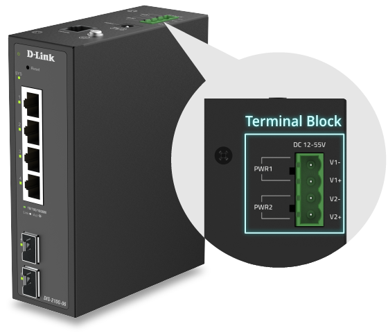 The DIS-210G-06 supports dual power supplies, and each is capable of independently powering the device. The redundancy ensures continuous operation when one power source fails, which minimises shutdown risk and maintains network performance.