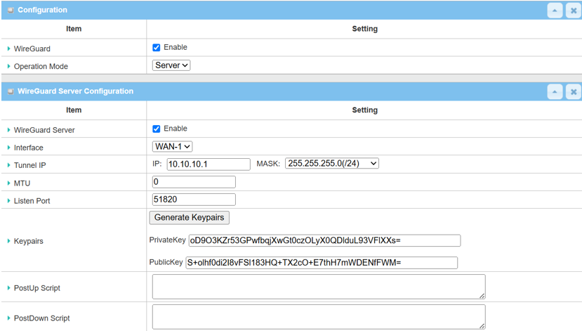 Specify the IP address (10.10.10.1) for the WireGuard client Select the Subnet Mask from the drop-down list |