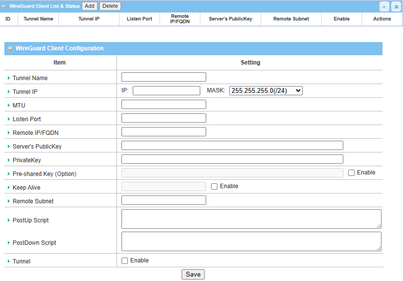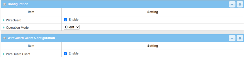 2. Click the Add button of WireGuard Client & Status to create WireGuard Client Configuration.