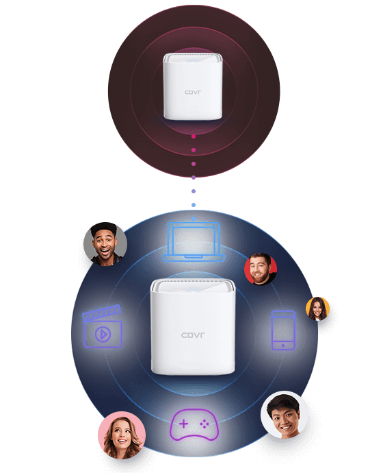 COVR-1102 ger upp till 325 m² trådlös täckning Lägg enkelt till extra COVR-1100-enheter för ytterligare 150 kvadratmeter Wi-Fi-täckning per Covr-punkt. Från lägenheter till fyravåningshus och källare till trädgård, ger Covr Wi-Fi-täckning för hela ditt hem.