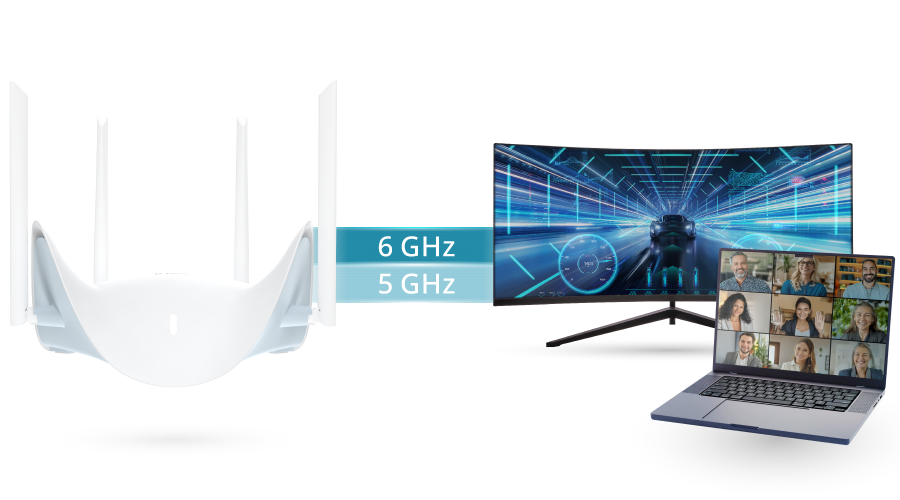 The R95 features the newly added 6 GHz band, which provides ultra-fast with more bandwidth, ideal for heavy streaming, gaming, and VR. Tri-band technology intelligently distributes traffic across three bands to reduce congestion and deliver a smoother, more stable connection, whether you're handling basic tasks or bandwidth-intensive activities.