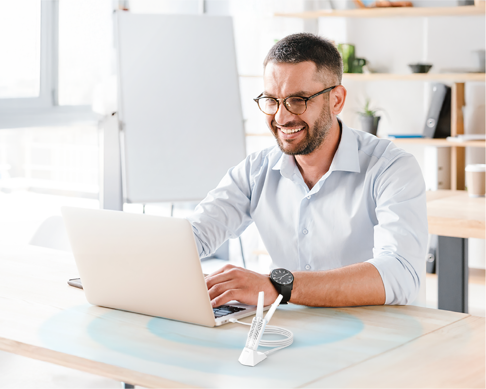 AE65U 配備兩根 180° 可調式天線,以及一個帶有延長線的可拆式底座,讓您靈活擺放,最大程度地提升訊號接收能力,輕鬆擴大電腦的 Wi-Fi 接收範圍與連線穩定性。
