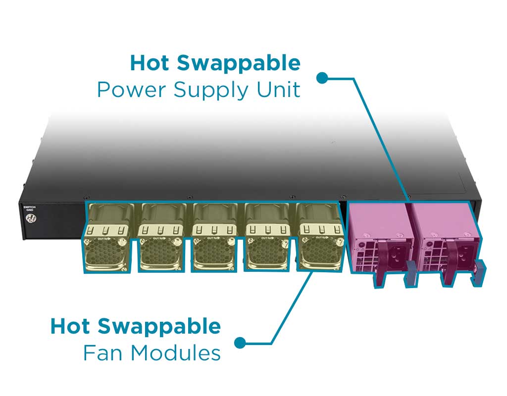 DXS-3610系列也採用模組化風扇備援設計,為系統提供n+1備援。模組化電源設計允許使用交流或直流電源,以實現最大的部署靈活性。採用雙電源模組,可分散電源負載,延長模組的使用壽命。