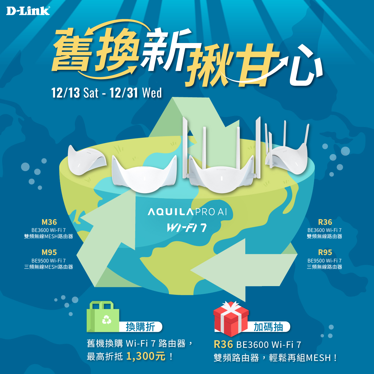 寄回家裡的舊路由器(不分品牌、年份,正常機/故障機/缺配件皆可),即可獲得 Wi-Fi 7 全系列商品(R95 路由器、M95 路由器、R36 路由器、M36 路由器)獨家換機優惠價